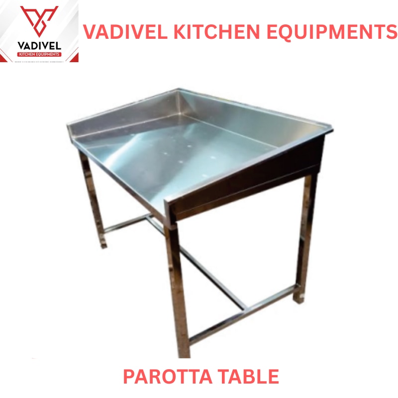 π½οΈ **SS Parota Table β Stainless Steel Table for Street Food & Hotel Use** Our **SS Parota Table** is specially designed for **parotta preparation**, ideal for hotels, street food stalls, cloud kitchens, and catering units. Built from **premium-grade stainless steel**, it offers hygiene, durability, and easy cleaning β making it a trusted choice for high-volume cooking. β **Product Highlights**: * SS 304-grade construction for long life & corrosion resistance * Heavy-duty flat worktop β perfect for parotta kneading & rolling * Optional bottom shelf for storing flour, oil, or utensils * Strong square tube frame for extra support * Available with or without side splash guard π **Standard Sizes**: * 48β x 24β * 60β x 30β * Custom sizes made to order