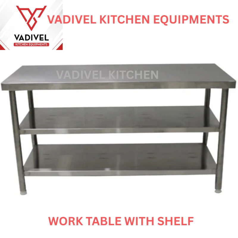 π οΈ SS Work Table with Undershelf | Vadivel Kitchen Equipment's Organize your commercial kitchen with our Stainless Steel Work Table with Undershelf, built for efficiency, hygiene, and durability. This versatile table is perfect for cutting, prepping, plating, or storing ingredients β a must-have for hotels, restaurants, bakeries, and mess kitchens. --- β Key Features: * Material: Full stainless steel (Grade 202/304 as required) * Top Surface: Strong and smooth for food preparation * Undershelf: Solid base shelf for storing vessels, trays, tools * Legs: Sturdy SS legs with adjustable bullet feet * Welds: Heavy-duty finish with polished edges * Sizes: Available in 3ft, 4ft, 5ft, 6ft β or custom-built --- π Ideal For: βοΈ Hotel & Restaurant Kitchens βοΈ Bakery & Pastry Prep Units βοΈ Industrial Canteens & Hostels βοΈ Cloud Kitchens & Catering Units βοΈ Tea Shops & Small Kitchens --- π OUR PRUCDUCTS: * SS work table with shelf for commercial kitchen * Stainless steel preparation table with undershelf * Hotel kitchen work table SS * Restaurant prep table stainless steel * Heavy-duty SS workbench with bottom shelf * Food-grade stainless steel kitchen table * **Canteen SS work table with storage** --- π Order Now from Vadivel Kitchen Equipmentβs π± **Phone**: +91 97898 09001 π¬ **WhatsApp**: [Click to Chat](https://wa.me/919789809001) *(Quick delivery & customization available)* π§ **Email**: [Vadivelkitchen.1@gmail.com](mailto:Vadivelkitchen.1@gmail.com) π **Factory**: No. 80, 81 Balaji Colony, Padi, Chennai β 600050 ---